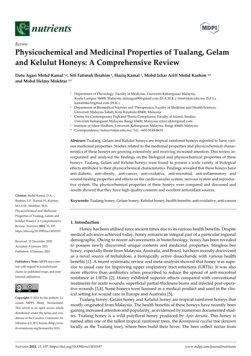 The medicinal properties of Tualang, Gelam and Kelulut honeys.